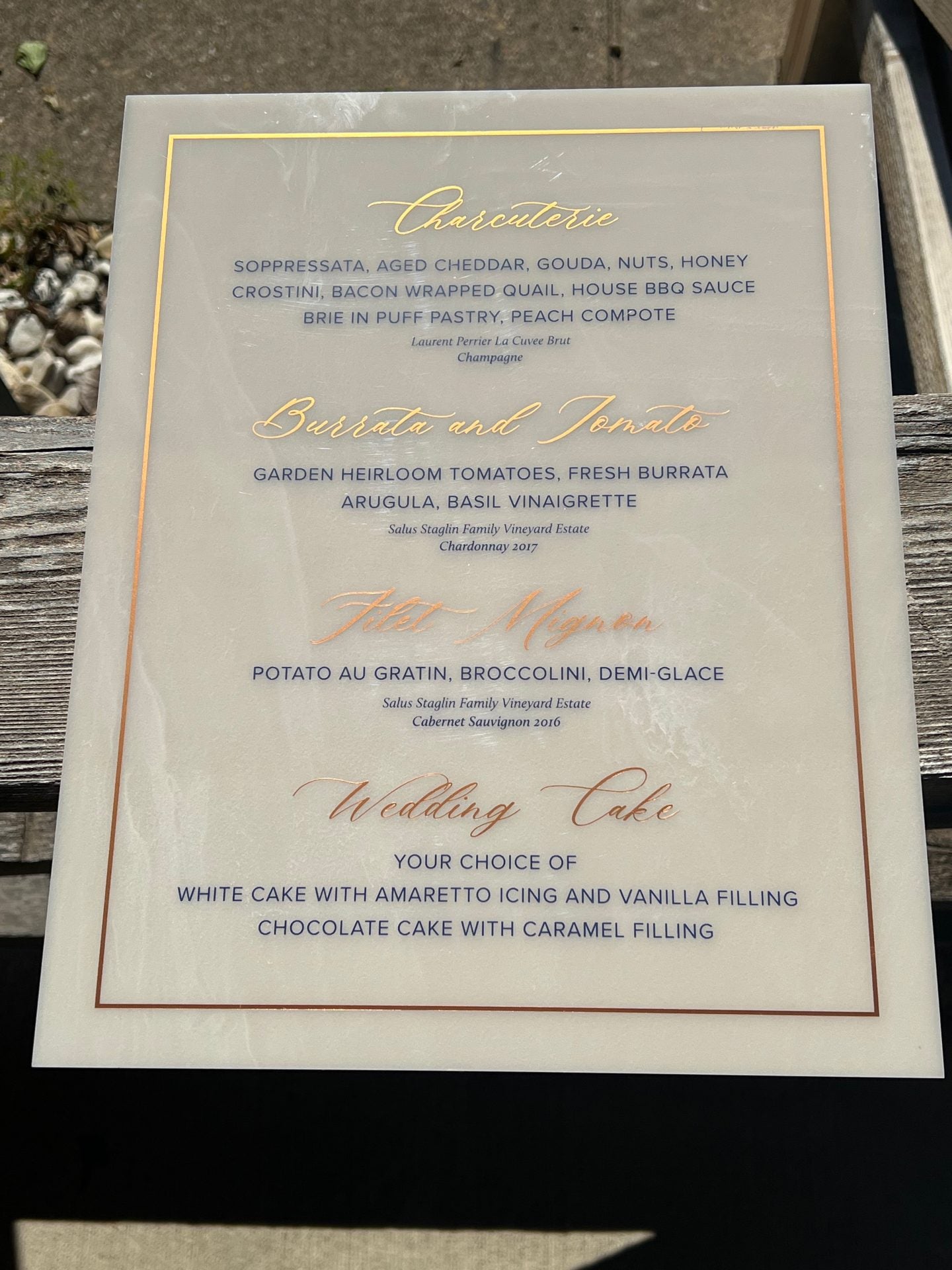 Crafted with a die-based, hot foil process, each invitation showcases precise foil detailing on high-quality acrylic, enhancing its luxurious appeal. Choose from our most popular color options, or reach out for a custom quote if you’re envisioning specialty acrylics or unique foil finishes to make your invitation truly one-of-a-kind.