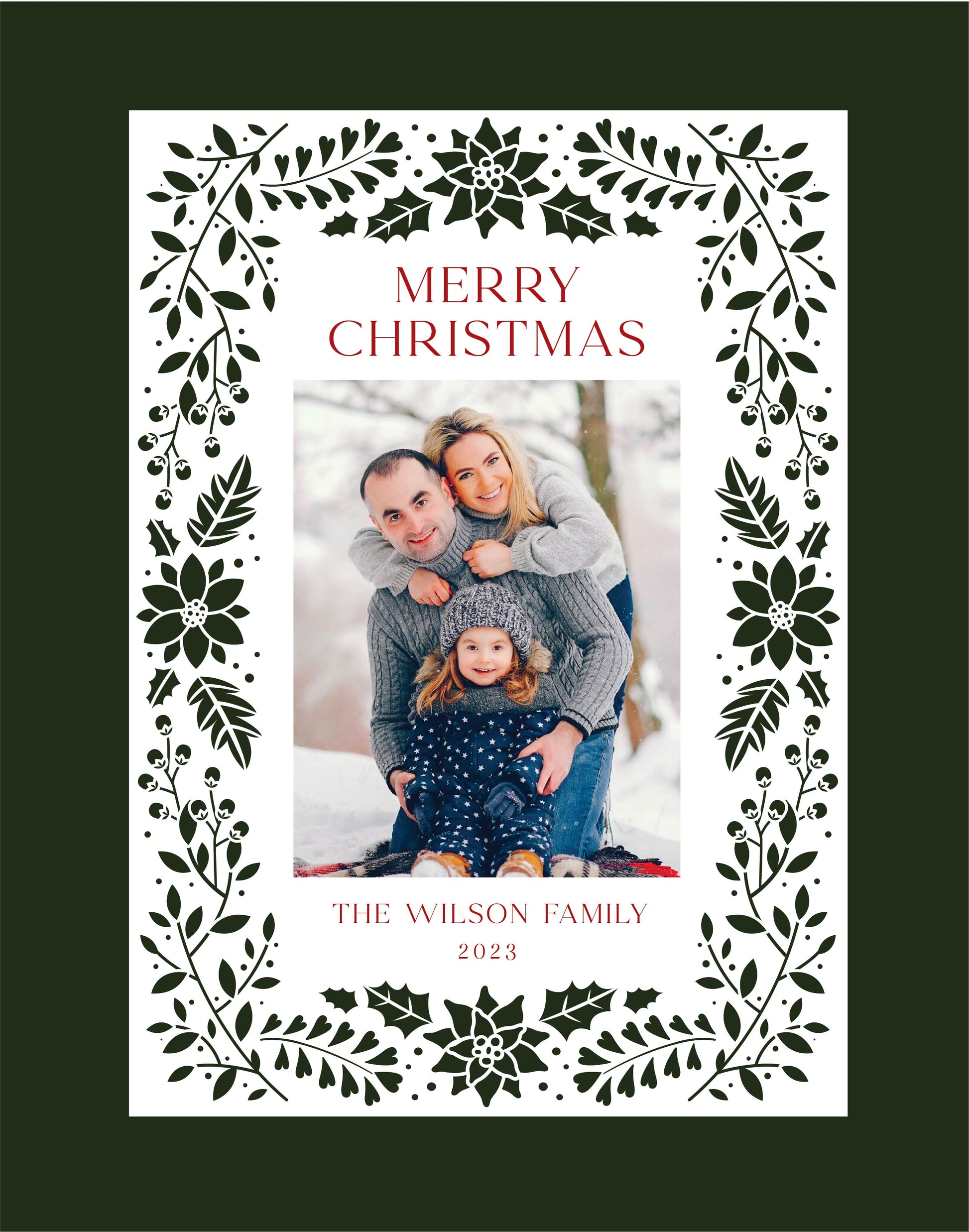 Why settle for the ordinary when you can create a keepsake that captivates? Our Laser Cut Picado-Style Holiday Photo Card elevates tradition with a touch of artistry and lasting warmth. With a meticulously laser-cut poinsettia and holly design, this card elegantly frames your family photo, turning it into an heirloom of holiday connection and joy.