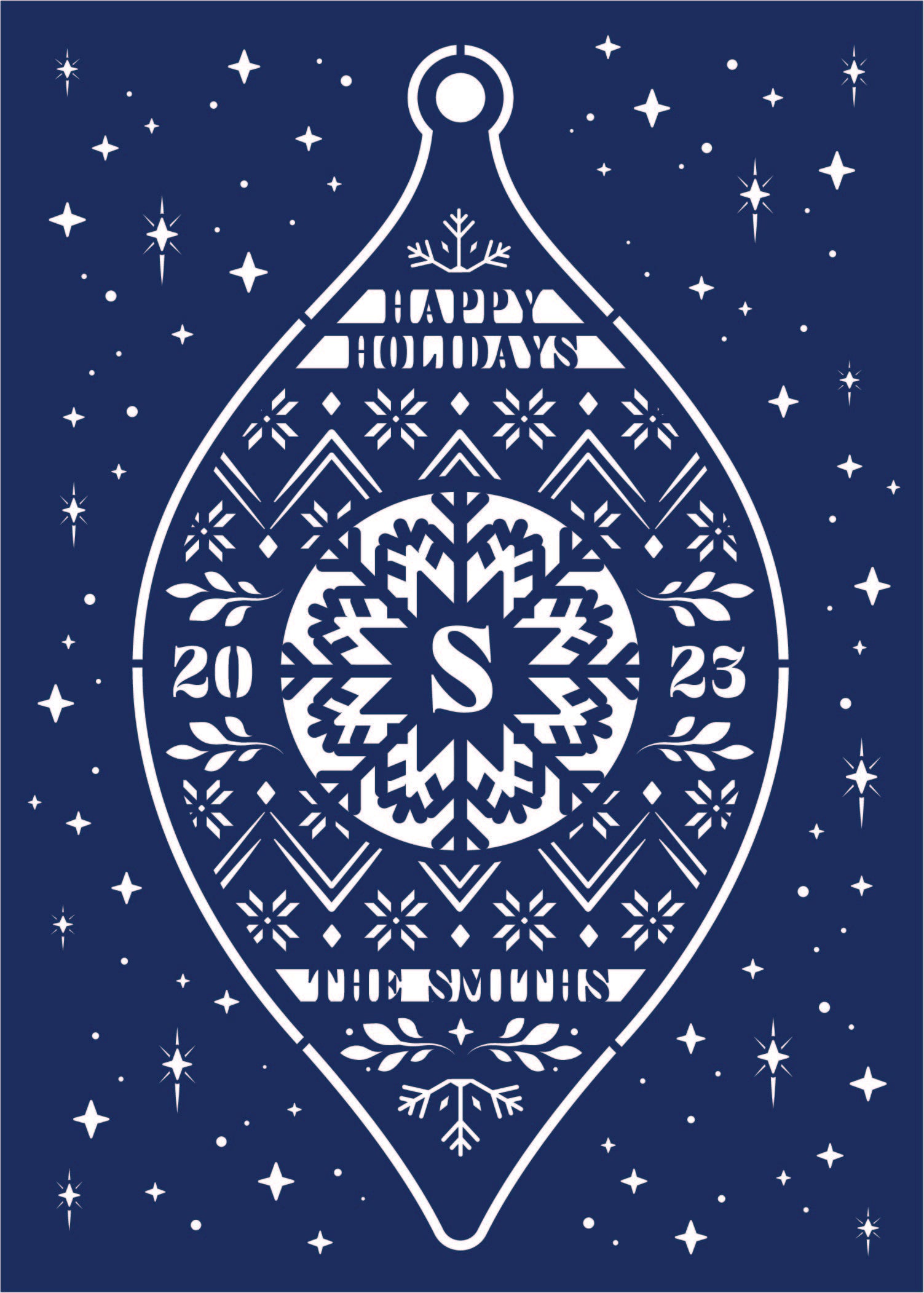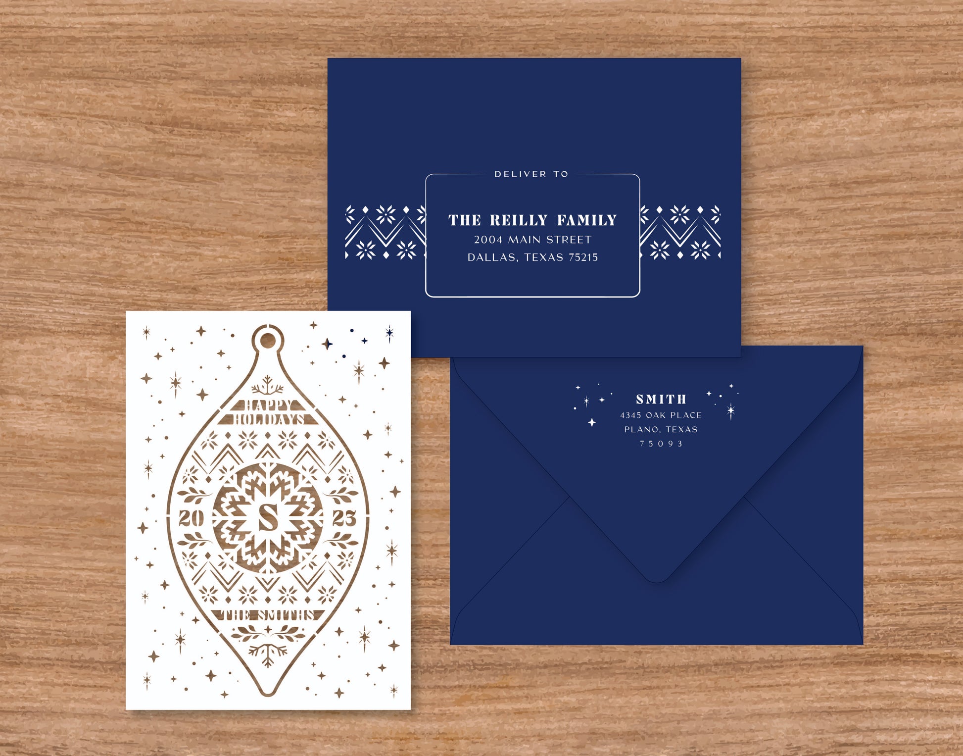 Why send the ordinary when you can make a lasting impression? Step beyond traditional holiday cards with our Laser Cut Picado-Style Holiday Ornament Card—an artful blend of precision and elegance. Adorned with a delicate snow and stars pattern, each card features a beautifully crafted ornament that transforms a simple greeting into a cherished keepsake.