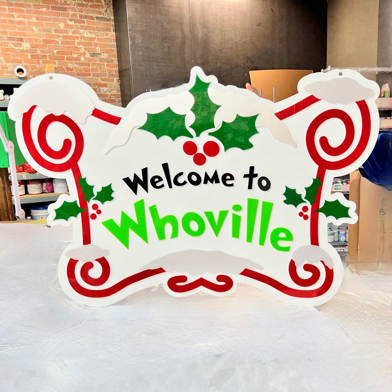 Step into the whimsical charm of Whoville with this 24x19 holiday sign, designed to capture the joyful spirit of the season and a nod to the Grinch’s heartwarming transformation. Featuring playful, curling letters and vibrant colors, the sign celebrates kindness, community, and the magic of holiday cheer. Perfect for adding a touch of Seussical delight to your seasonal décor!
